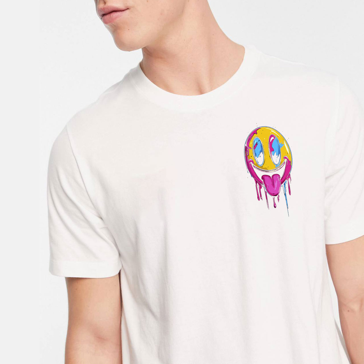 تیشرت نخی آستین کوتاه طرح اموجی خندان رنگی، تصویر یک چهره صورتک خندان که از روی آن رنگ شره کرده است را روی خود نشان می دهد.