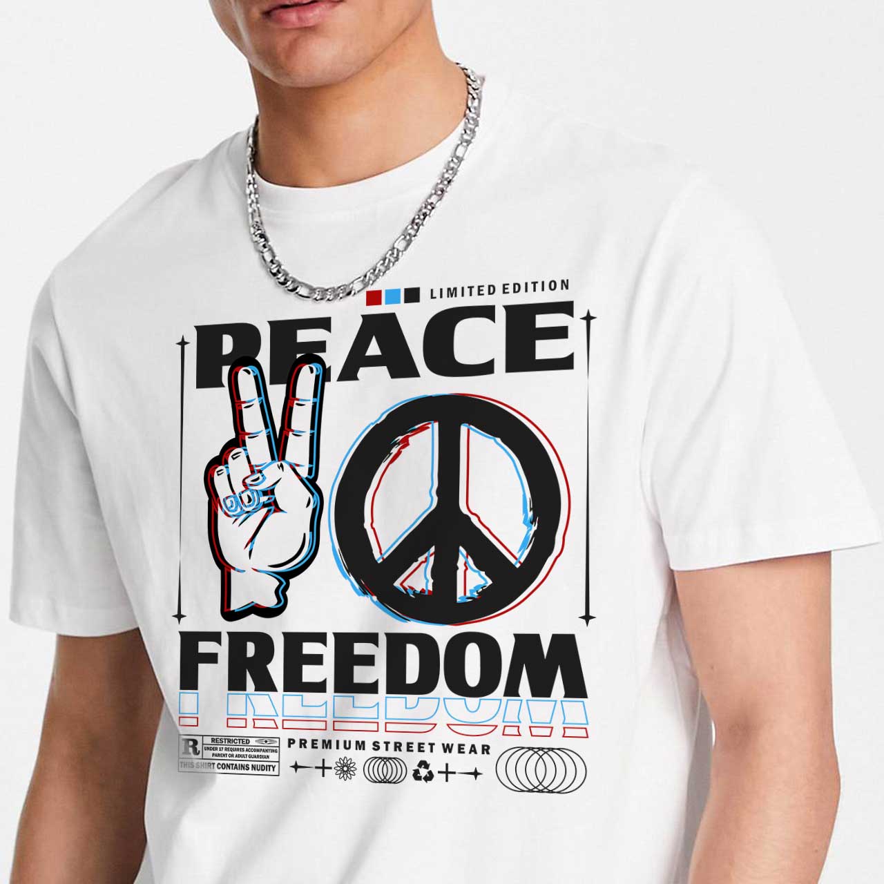 تیشرت طرح صلح و آزادی peace and freedom که شاید با توجه به نمادهای روی آن، بتوان از صلح و برابری هم یاد کرد. نوشته انگلیسی peace به معنی "صلح" freedom به معنای "آزادی" را روی خود نمایش می دهد. سایر نوشته ها هم به تولید تعداد محدود از این محصول و کیفیت برتر آن اشاره دارند.