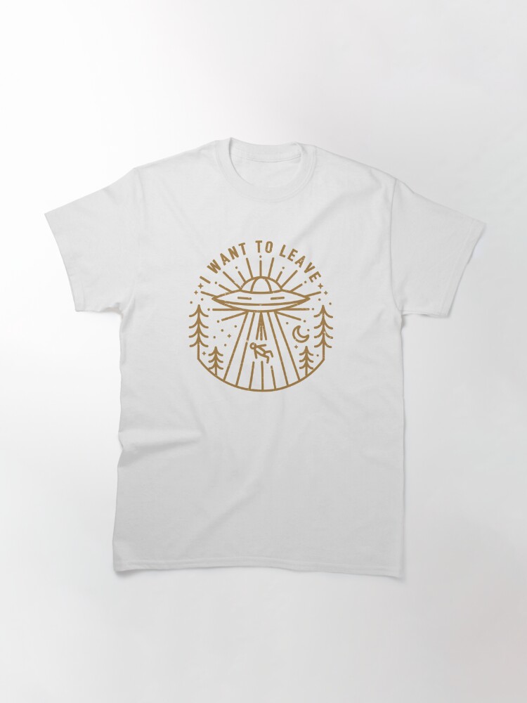 تیشرت نوین نقش طرح I Want To Leave تصویر انسانی را نشان می دهد که در حال رفتن به یک سفینه فضایی است.