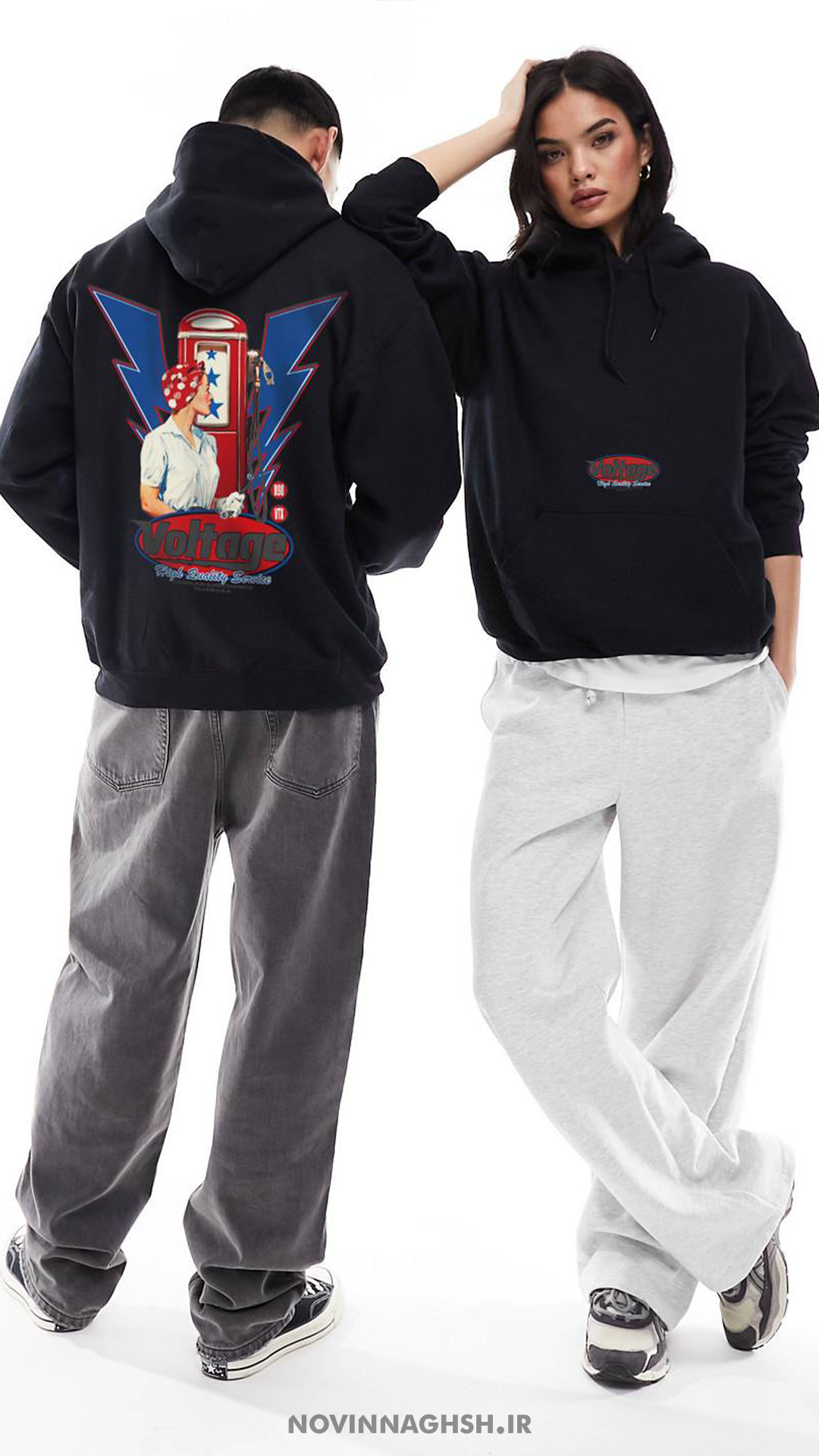 هودی طرح ولتاژ VOLTAGE با سایزبندی، تهیه شده از پارچه نخ پنبه ضخیم کرک دار است.